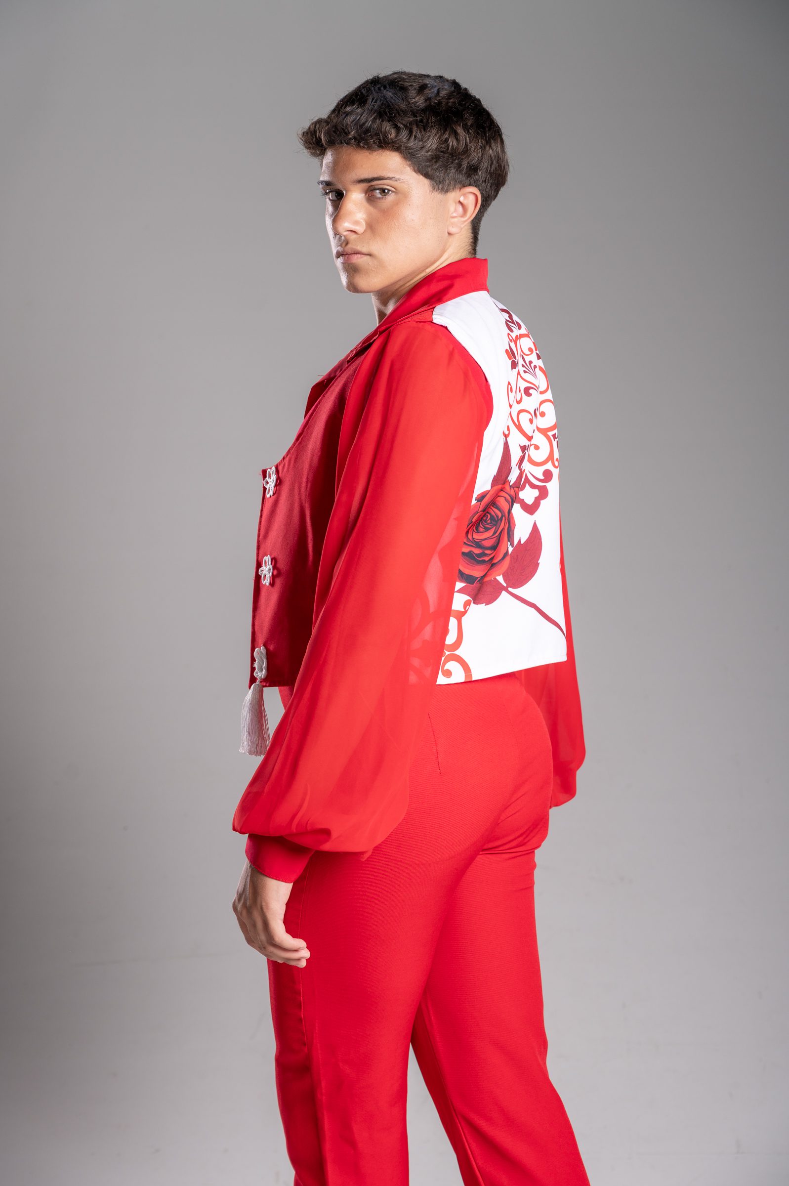 Traje Rojo con chalequillo estampado y mantón